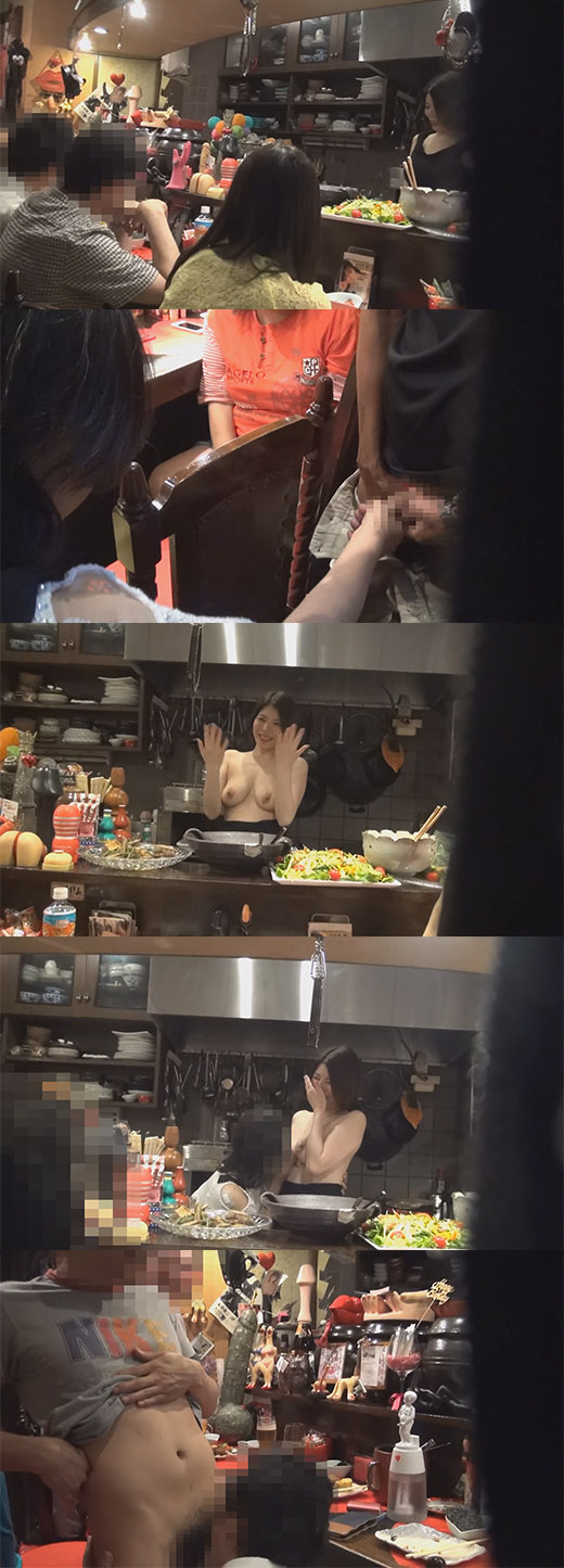 やがて、客にそそのかされたママがカウンターの中で服を脱ぎはじめかなりおおきなおっぱいを丸出しにしてい