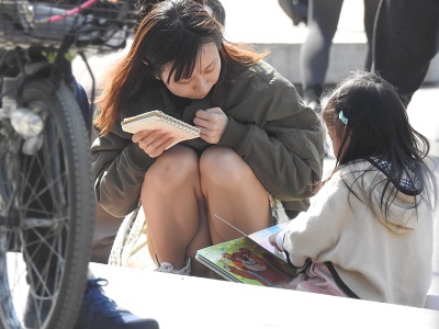若ママ風の可愛いお姉さんが、しゃがんだり石椅子に座ったりして、パンスト越しの柄模様のパンティーを見せてい