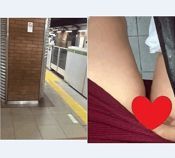 内。男性の目の前にはスカートを履いた女性が立っています。よく見ると持っているスマホがスカートの下の位