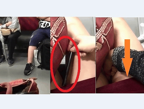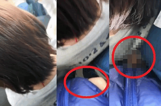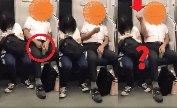 集中しているのか後ろの男性には注意していない様子。それを確認したかのように、男性がおもむろにズボンに